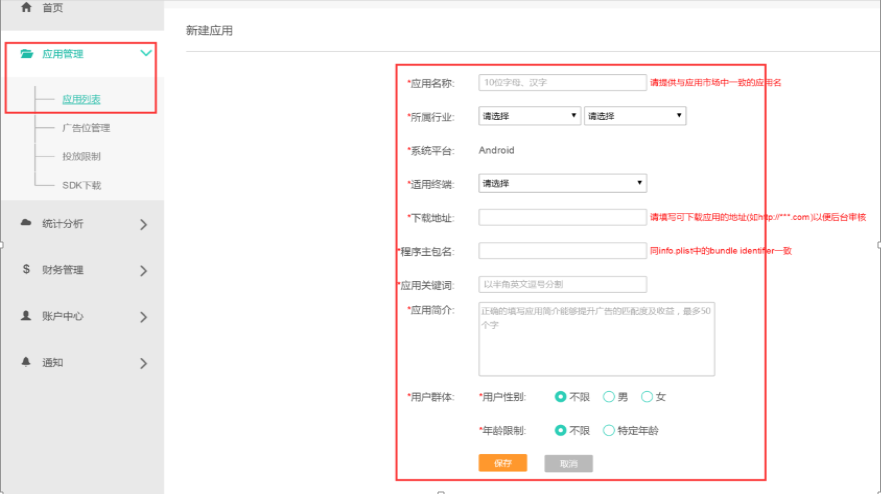 注:应用创建完成后,应用ID即生成。状态进行审核中,审核中的应用不可进行编辑。但可以新建广告位。应用审核通过后,创建广告位,下载SDK植入代码,即可请求广告。